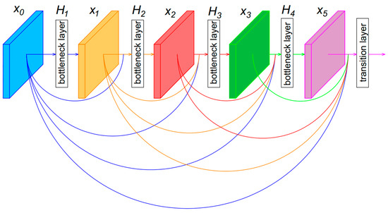 In contrast to ResNet, the feature maps in DenseNet are not combined through summation before they are passed to the next layer. Instead, in each dense block, the feature maps of the current layer are concatenated with feature maps from previous layers as an additional channel. Therefore, the lth layer has l inputs which are feature maps from all preceding layers . Equation (3) shows how DenseNet performs a non-linear transformation at the lth layer [42]: