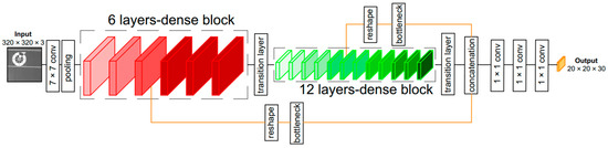 Figure 5 shows the proposed lightDenseNet architecture with two dense blocks along with two lateral connections. The previous DenseNet architecture with four dense blocks shows superior classification performance on the large ImageNet dataset, which includes more than one million images (for training and validation) and one thousand classes [42]. However, our marker dataset is much smaller than ImageNet and has only two classes of marker and background; therefore, we do not need a deep CNN architecture to extract features. Thus, a network with two dense blocks is a suitable solution. Moreover, a network with four dense blocks is too deep and increases the processing time; therefore, a two dense-block model is the optimal solution to balance between accuracy and processing speed.