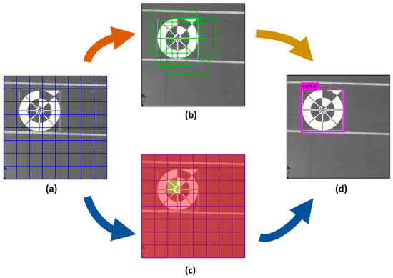 YOLO v2 uses a different method than Faster R-CNN to predict bounding boxes based on prior anchor boxes. YOLO v2 anchor boxes are not chosen by hand but are determined by analyzing all the ground-truth bounding boxes in the training set. In our research, we trained the CNN of lightDenseYOLO using the same five prior anchor boxes used to train YOLO v2. Figure 7 shows an example of how YOLO v2 detects a marker by dividing the input into grid cells (Figure 7a). Each grid cell is responsible for generating five bounding boxes based on five prior anchor boxes as shown in Figure 7b. If the center of the object from the ground-truth data is located inside the yellow cell in Figure 7c, that grid cell can contribute more than the red cells during training. Therefore, a single input image needs to pass through the neural network only one time during training and testing and enables a real-time processing speed (Figure 7d). Each YOLO v2 predicted box not only includes center coordinates, width, height, and confidence score but also the C class probability. Therefore, the size of the YOLO v2 final output tensor is where S and B are the numbers of grids and bounding boxes, respectively. After the model is trained, the problem of selecting the best boxes becomes easier. In our research, we used S, B, and C as 20, 5, and 1, respectively, for testing of our lightDenseYOLO. If any bounding box had a class probability value larger than the threshold value, that box was deemed to have a higher potential to contain an object. Once again, the non-maximum suppression algorithm was used to determine the final detected boxes [39].