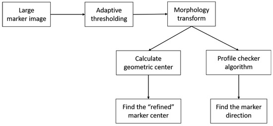 In our previous research [3], we used the Profile Checker v1 algorithm to accurately find the center of the marker from that predicted by ATM at a close distance. Even though our lightDenseYOLO predicts a much more accurate marker center than ATM (as shown in the experimental results in Section 4.2.3), there is still room for improvement. Figure 8 shows the flowchart of the proposed Profile Checker v2 to find the marker center and direction for the large predicted bounding box. The main difference we made in this new version is that we performed image transformation before using it as an input to the Profile Checker v2 algorithm.