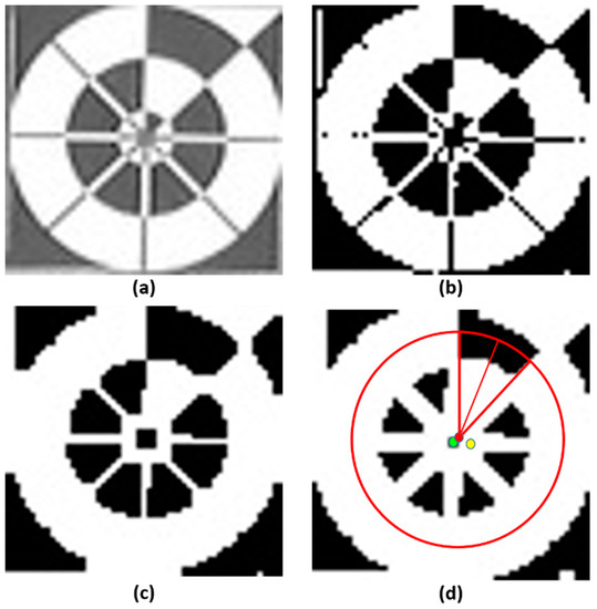 In the long-distance images, the size of the predicted marker was small; therefore, the difference between the predicted center and the ground-truth center was also small, and it was difficult to detect the marker direction in such cases. In our research, we used Profile Checker v2 algorithm to find the marker direction and the sub-optimal center of the large predicted box obtained from lightDenseYOLO. Our Profile Checker v2 algorithm starts with adaptive thresholding on the extracted marker image. The threshold value is set as the mean value of the block of an adaptive size, and we set the block size equal to a quarter of the predicted box width [46]. As shown in Figure 9b, a large amount of noise needed to be removed. To reduce the noise, we used a simple “Opening” morphology technique [47] (Figure 9c). Furthermore, dilation was performed to fill some small holes in the obtained image (Figure 9d). Next, we found the geometric center (red dot of Figure 9d). As shown in Figure 9d, compared to the predicted lightDenseYOLO center (yellow dot), the marker center predicted by Profile Checker v2 algorithm (red dot) was much closer to the ground-truth center (green dot).