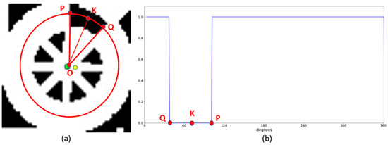 To determine the direction of the marker, we used the same Profile Checker v1 method [3]. Using the obtained image (Figure 10a), we drew a circle based on the center obtained by the lightDenseYOLO, and the radius of this circle was empirically selected as 0.4× (width of marker). We refer to this circle as the profile and all its segments as sub-profiles. This profile includes all pixel values along the generated circle. With these values, we applied a threshold to create a profile with one black and one white sub-profile as shown in Figure 10b. The threshold was defined as the mean value of the maximum and minimum value of all the obtained values. A value larger than the threshold was determined as 1; otherwise, it was set to 0. From that, point “P” and “Q” were detected and the direction was estimated based on the midpoint “K” of the arc connecting “P” and “Q” with the detected center “O” of Figure 10a.