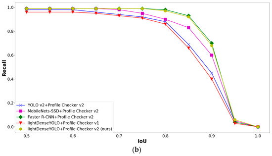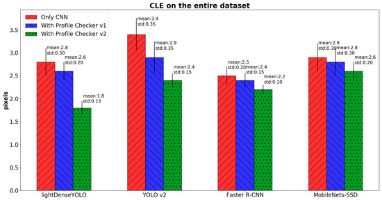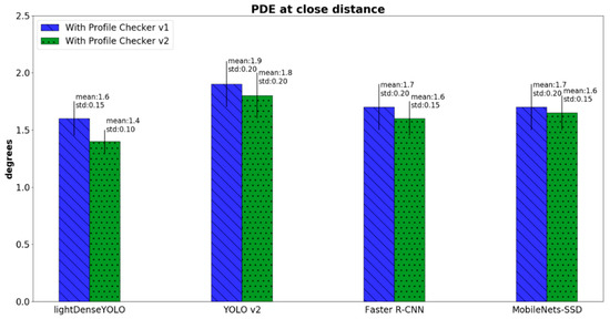 where and are the predicted and ground-truth directions of a marker, respectively. Figure 20 shows the PDE comparison between our method and that of other CNN marker detectors. Conventional CNN detectors such as YOLO v2, Faster R-CNN, and MobileNets-SSD do not predict marker direction; therefore, we applied the Profile Checker v2 algorithm for fair comparison with our method. Our method not only had the smallest PDE, but also the smallest standard deviation as shown in Figure 20. In addition, Profile Checker v2 showed better marker-direction prediction than that of Profile Checker v1.