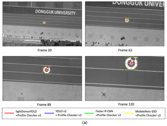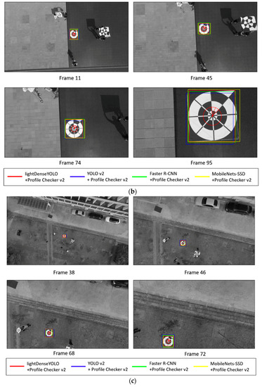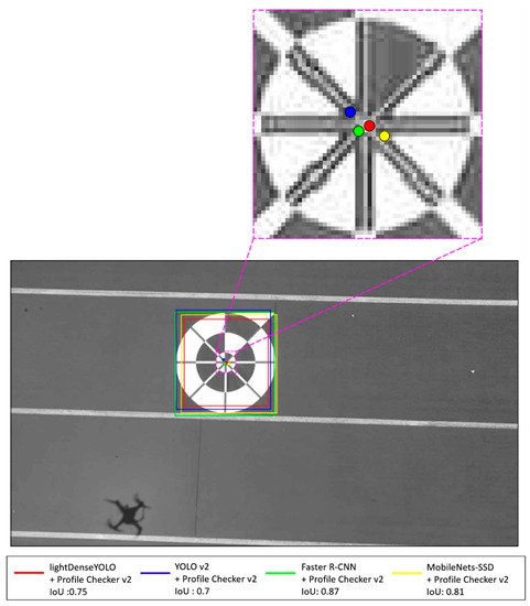 Figure 21 shows the marker detection examples obtained by our method and previous methods from our DDroneC-DB2 dataset at three different time of day: morning (Figure 21a), afternoon (Figure 21b), and evening (Figure 21c). In our experiment, we used the DJI Phantom 4 remote controller with its default setting of Mode 2 (left stick controlling the throttle) and manually pushed the left stick up until the drone reached a height of 50 m. Then we let it descend using the return-to-home (RTH) function to land it safely on the ground. For simplicity, we showed the detected center and direction only by our method of lightDenseYOLO + Profile Checker v2 in red. As shown in Figure 21, the marker was successfully detected at both long and close distances in all cases, and our method showed comparatively better results than those obtained by other methods. Moreover, using the detected center obtained by our proposed method, we improved accuracy of center detection and the direction of the marker using the Profile Checker v2 algorithm. The other circular targets in Figure 21b,c are used for testing whether our method generates false positives or not. As shown in Figure 21, there were no false positive cases even with the other circular targets in the experimental images.