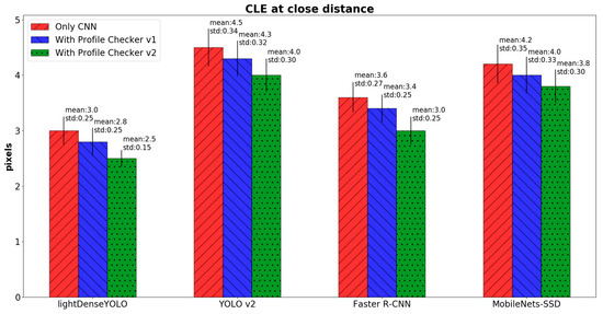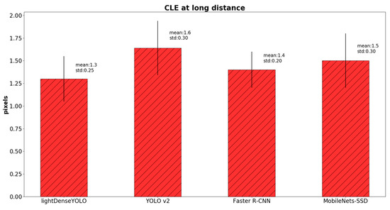 In Figure 19, we further compared the CLE of our CNN-based method not only with our previous remote marker-based tracking algorithm [3] but also with conventional non-CNN object trackers such as multiple instance learning (MIL) [67], tracking-learning-detection (TLD) [68], Median Flow [69], and kernelized correlation filter (KCF) [70]. Our CNN-based method showed superior detection accuracy above the other methods. These state-of-the-art object trackers [67,68,69,70] produced high CLE because they were not designed to track objects whose appearance and size keep changing in the captured image like our marker. However, our method can track a marker from a long distance even the size of the marker changes drastically.