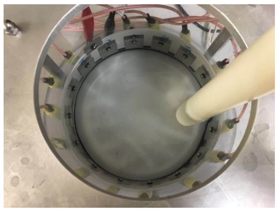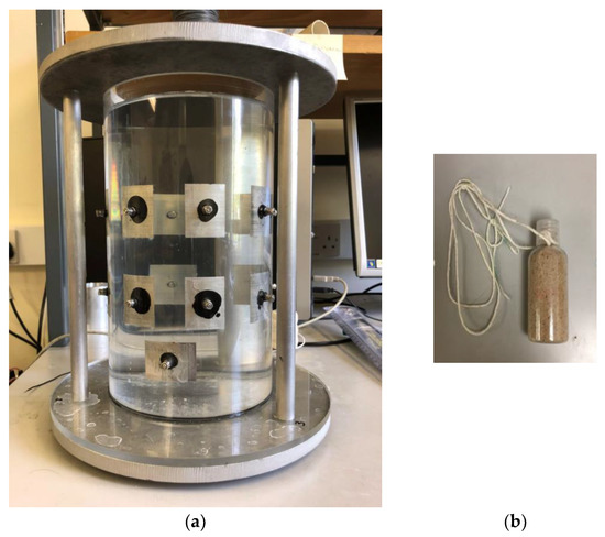 The phantom used for the 3D experimental test is designed as a 16-electrode cylinder container with a height of 25 cm and diameter of 14 cm and using the same material with all components as the 2D one. Two rings of eight electrodes (3 cm × 4 cm rectangular-shaped) are fixed on the wall of the sensor at a height of 9 cm and 16 cm, respectively, which is consistent with the situation of the simulation test. A small plastic bottle filled with sand was used to stand in for a dispersed phase and tap water was poured into the phantom as a continuous phase. To create a relative movement, the bottle was controlled to move up and down continuously using a string that connected with the bottle. As shown in the pictures, the bottle was released down and pulled up vertically (starting from the water surface). During the movement, it was on the left-hand side and close to the inner wall of the sensor. The data collection system and method are identical as mentioned before, and the driving frequency was set to be 10 KHz. Figure 13 shows the 3D experimental phantom and the inclusion.