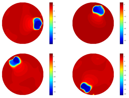 The linear inverse problem in ERT can be defined as the recovery of a change in conductivity from a change in measured boundary voltage , where . The Jacobian J is computed by the Fréchet derivative of u with respect to [23]. In this case, a reference boundary voltage is available, where ,, and