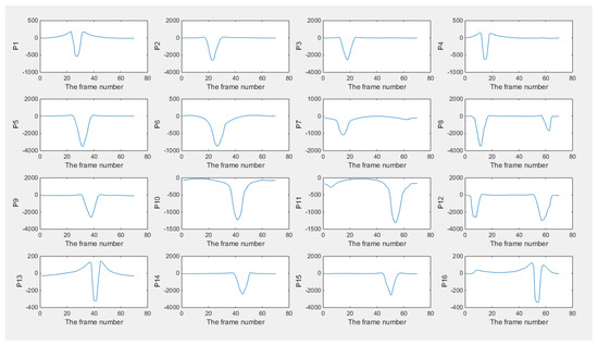 Plots of pixels of the result 2D experimental test with phantom inclusion in the ERT unit: plots of 16 pixels are displayed here, where the peak means that the inclusion entered and left the area of the specific pixel.