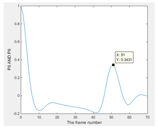 The cross-correlation results: the x-axis indicates the frame number, and the y-axis gives the value of the cross-correlation result. The peak value on the x-axis in this case indicates the transit time of this movement.