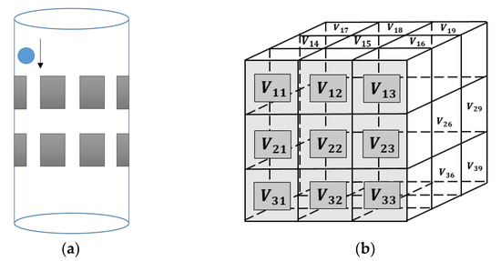 In the vertical direction, 71 locations of the inclusion were chosen evenly between (5, 0, 16) and (5, 0, 9), where it was assumed that the sphere was dropping 0.1 cm each step, and a frame (208 independent measurements) of the image is produced split into 27 voxels (3 × 3 × 3). A drawing of the experimental phantom and voxels distribution is shown in Figure 9a,b respectively. The cross-correlation procedure for 3D is similar to the 2D one. For all voxels, a vector of length 71 (number of frames) could be composed by 71 average values from each of the frames, and there were 27 vectors generated in total. Frames are time-related with each other, and the data collection speed of the ERT system and the overall velocity of the movement are both constant, hence, 27 signals are generated. With the cross-correlation method, the transit time between two different voxels comes to be available from signals of different voxels, and the overall flow speed could be calculated with distance.