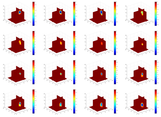 Reconstructions of the movement using temporal TV: a dynamic 3D image was produced, and 16 images selected among 200 frames showing that the movement of inclusion was started from the top move down to the bottom, and come back to top. The Blue object in images (refer to the color bar) corresponds to where the inclusion arrived at that time-step.