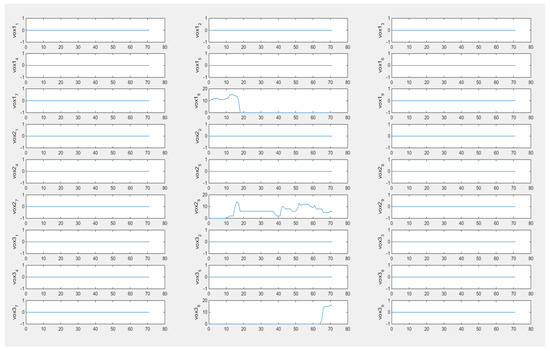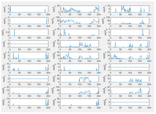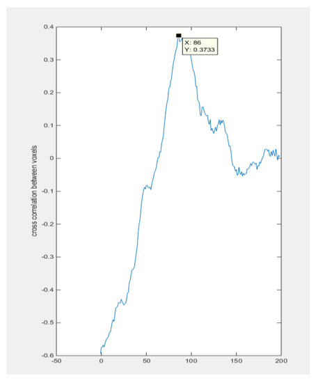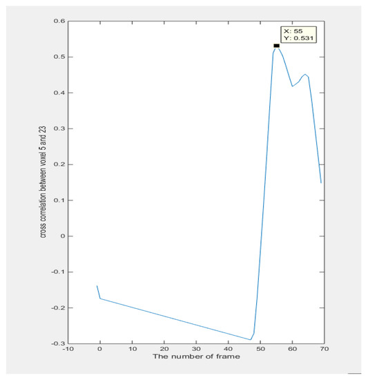 In Figure 11, the output vectors of 27 voxels from 71 frames are plotted, which illustrate the moving process of the object within the simulated phantom. From the plot of vox18, vox28, and vox38, it could be seen that the characteristic value is fluctuating, which could be understood as the process of how the inclusion was entering and leaving the specific voxels. The plots of signals from other voxels are a parallel line and the value remains at 0, which indicates the sample did not go through them and this is consistent with the set up of the simulation test. For cross-correlation of a 3D case, the distance in function (20) is a known constant and determined by the size of height as we defined the sensitivity map (Figure 9b). Considering that the object is moving from vox18 to vox38, the required time could be calculated from the peak value of the cross-correlation plot between these two voxels since the object is moving downwards from vox18 to vox38. Hence, the speed calculation would be achievable. Figure 12 shows the result of the cross-correlation.