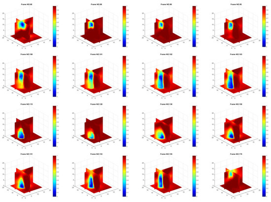 During the experiment, there were periods where the bottle movement happened, and 200 frames were collected. The pictures shown in Figure 14 illustrate the whole movement process. Compared with the reconstructed images of the simulation test, it seems that experimental test obtained a slightly degraded result. However, during the simulation, a certain location of the object corresponds to the calculated boundary voltage data, which contributes to a frame of the image. For the 3D reconstruction of the experiment, the real boundary data is measured by a data collection system, and is coming from the dynamic movement of the bottle. It is worth emphasizing that the time required to measure the data of each frame could not be neglected, whereas the simulation did. During this time interval, the bottle was still keep moving, which leads to inter-frame data being produced.