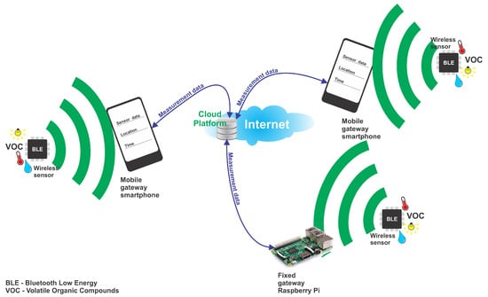 The experimental setup consisted of a proof-of-concept system that represents a complete IoT-based solution for monitoring temperature, relative humidity and equivalent CO2 and VOC concentration levels within a large area. By using Bluetooth Low Energy, a technology native to a wide range of personal electronic devices, we argue that our developed monitoring system can make use of participatory and opportunistic sensing. Therefore, the complete monitoring solution presented and analyzed in this work can help achieve real time fine-grained air pollution maps, and can be applied to smart cities or buildings. The major drawback of the proposed solution is that it does not provide measurements as detailed and as accurate as traditional stations. However, this is compensated by the advantage of not requiring a fixed infrastructure, the gateways being represented by BLE-enabled electronic devices, such as smartphones or laptops. In this way, the maintenance activities are less demanding and the costs for commissioning and support are reduced. This means that the wireless sensors this solution incorporates can be deployed in large numbers over large areas and can be used for complementing existing traditional monitoring installations. In this way, fine-grained maps showing spatial data and the changes in environmental conditions and pollutant levels close to the source of emissions can be obtained. This class of monitoring applications also involves the citizens and aims to increase people’s awareness towards the environment by enabling efficient data collection from sensors by personal devices such a smartphones.