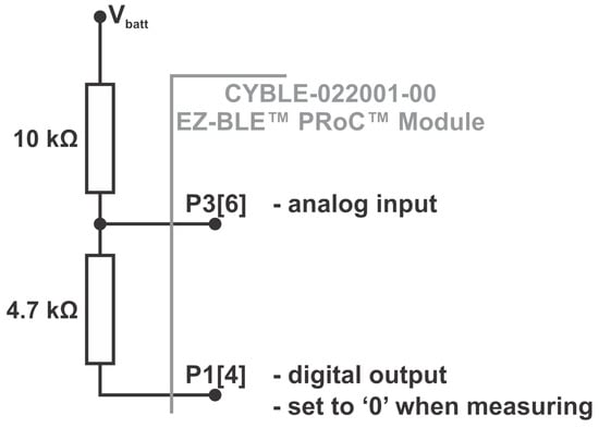 The application running on the CYBLE-022001-00 module implements a BLE generic access profile (GAP) broadcaster that advertises the data acquired from the attached sensors in non-connectable undirected mode on all channels with an advertising interval of 5 s Since the sensors consume more power than advertising, they are sampled at different periods, depending on their power consumption and on the voltage level estimated for the rechargeable battery and on the light intensity. Therefore, the SHT21 temperature and relative humidity and the OPT3001 light intensity sensors can be powered and interrogated every minute. At this time, the battery voltage is also computed by sampling the internal ADC and a scaling factor of 3.14 is applied. This scaling represents the ratio between the real voltage of the battery and the measurement of the voltage on the output of the resistive voltage divider as shown in Figure 4. If the illumination and the battery voltage are above certain thresholds, as the following paragraphs will show, the active period is prolonged and the attached gas sensor is also interrogated. Between these activities, the device is programmed to enter low-power mode in order to save as much energy as possible.
