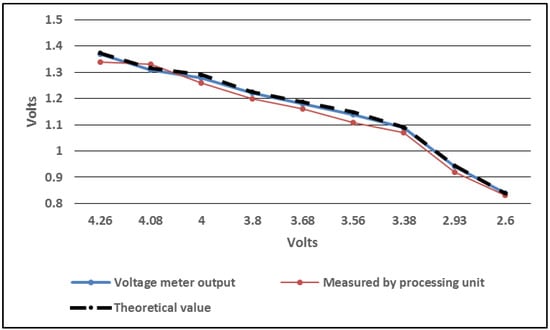 We conducted experiments to determine the relationship between the battery level and the values acquired by the processing unit and to validate the correct values that are used for estimating the available energy budget. The wireless sensor was powered by a laboratory power source and a voltage meter was used to measure the value on the P[3] input during the measurements. Figure 4 presents the data obtained during the experiments. These values are used for estimating the battery level at certain times during the operation of the device. The results show that the method for estimating the charging state of the battery has an acceptable accuracy and can be used for developing strategies for sampling the sensors at different time intervals depending on their power consumption and mode of operation.