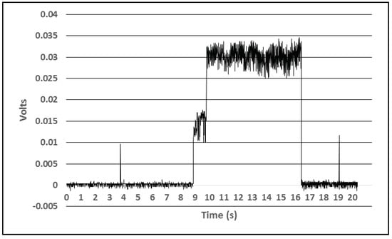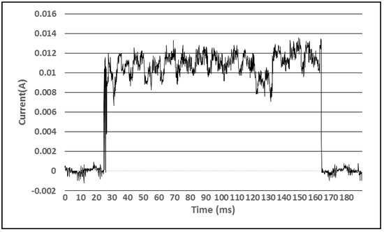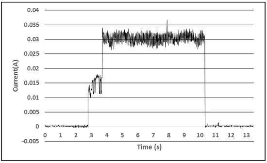 To analyze the power consumption of the sensor devices and to estimate their operation period using the complete charge of the accumulator we used a Tektronix TDS2012C oscilloscope and a special setup, consisting of an INA138 integrated circuit and a resistance [21]. This was set to measure the power consumption profile of the BLE environmental beacons depending on the activities they perform. Figure 5 presents the power consumption of a BLE sensor that measures the temperature and relative humidity, light intensity and battery levels during one active interval, lasting for 140 milliseconds. This event consumes a total energy of 20.51 J when taking place once per second. The accumulator contains 1600 J of energy, so the device could operate for 80 h on a single charge if the temperature and relative humidity and light intensity sensors are sampled once per minute.