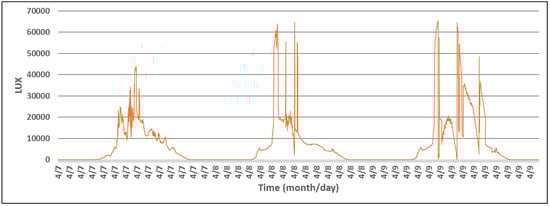 Light intensity measured by a T, RH, and LUX beacon during three days.