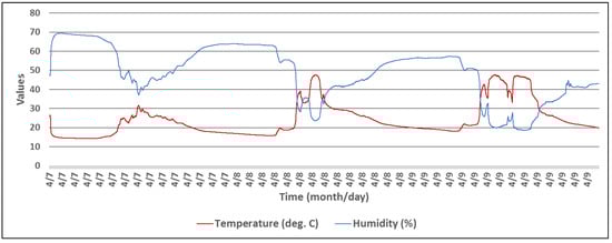 For the first set of experiments, a wireless sensor was set to measure T, RH, and light intensity levels, during a period of three days. The experimental setup consisted of the wireless sensor, that was placed in an area exposed to natural light during the day, and a Raspberry Pi single-board computer running the Observer application. The activities performed by the sensor are presented in Algorithm 4, and the collected data is presented in Figure 9 and Figure 10.