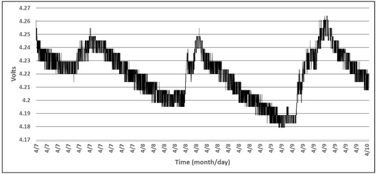Figure 11 shows the battery level during all the time when the wireless sensor was operating thereby revealing that the accumulator is actually charged when a one minute sensor sampling interval is used and the solar cells are exposed to direct sunlight during the day. From Figure 11 we note that the acquisition of the battery level is not a highly accurate measurement, but the readings can give a satisfactory estimation of the charging state of the accumulator, so that appropriate decisions can be taken by the processing unit with respect to the sampling period of the attached sensors. We attempt to find a compromise between the measuring circuit power consumption, complexity and accuracy. This was achieved by selecting the battery level and light intensity thresholds that lead to the modification of the sampling rate used for the CCS811 sensor, the most power hungry component in the system.