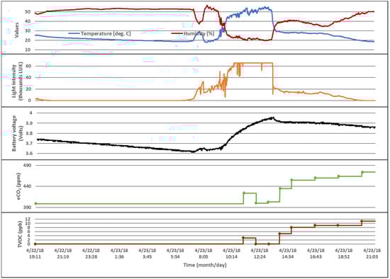 The data acquired by a device that implements an application flow similar to the one presented in Algorithm 3, where the CCS811 sensor is sampled according to different intervals depending on battery level and light intensity, is shown in Figure 14. The points where the eCO2 and TVOC values are measured are represented on the plots with diamonds. Since the values are represented on two bytes, the light intensity that is transmitted does not exceed this limit even though the measured value is larger.