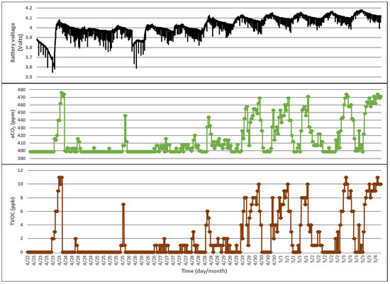 The data gathered over these three days shows that a device that measures the temperature, relative humidity and light intensity, can operate solely on the energy harvested by the solar cells that charges the attached accumulator. The next step was the inclusion of the sampling of the air quality sensor into the application. Therefore, different sequences of events similar to the one listed in Algorithm 3 were implemented in the firmware of the wireless sensor. Figure 12 shows the equivalent CO2 concentration measured by a device during a day while Figure 13 represents the TVOC plot.