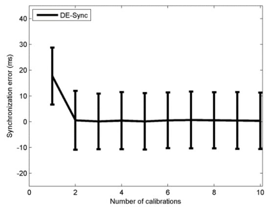 In the calibration process, DE-Sync compensates for the effect of the clock skew in the Doppler scale factor. First, we analyzed the influence of the number of calibrations on the amount of synchronization error. The simulation result is showed in Figure 2, from which we can see that when the number of calibration is 1, the Doppler scale factor is not corrected and the synchronization error is larger. The Doppler scale factor is corrected when the number of calibrations increases, starting from 2. The simulation results show that the synchronization error decreases with an increased number of calibration times, and the performance is enhanced as expected.