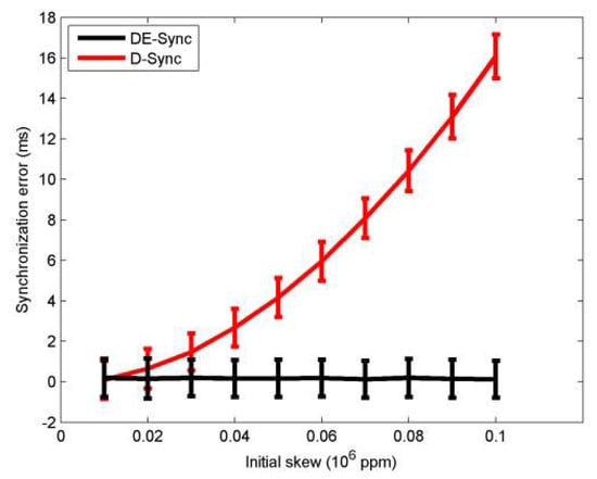 Due to the effect of the skew during the process of estimating the Doppler scale factor, the DE-Sync performance with its initial skew needs to be analyzed. According to the references [25,26,27,28,32], the inherent skew can be selected with the range from 50 to 106 ppm. However, the inherent skew rarely can reach 106 ppm in practice. Without loss of generality, the simulation is performed with the range of the inherent skew from 104 to 105 ppm. The simulation results are shown in Figure 3, which shows that the synchronization error of the D-Sync deteriorates with an increased skew and DE-Sync has consistent performance across different skews. Notably, DE-Sync significantly outperforms D-Sync when there is a larger skew. In other words, when the initial skew is less than a certain value (104 ppm), the difference of performance between two schemes can be negligible. In the following simulations, we will compare the two schemes using a larger value of the skew (0.05 × 106 ppm).
