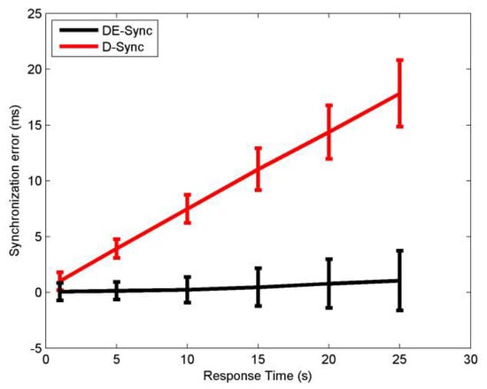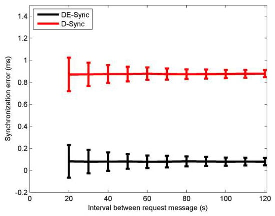 Figure 7 shows the mean and standard deviation of synchronization error for DE-Sync and D-Sync when the time interval between request messages of a node is varied between 20 s and 120 s. Increasing the interval between request messages is equivalent to increasing the dynamic range of linear regression, which allows enough time to elapse before initiating the next message exchange. Performing Equation (13) to enhance the estimation accuracy of the skew and offset, the synchronization error decreases with the increased interval. As described before, DE-Sync has a lower mean of synchronization error than D-Sync. Observing Figure 7, simulation results are in agreement with the expectation that DE-Sync outperforms D-Sync.