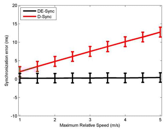 Figure 5 illustrates the mean and standard deviation of the synchronization error for DE-Sync and D-Sync when the maximum relative speed of a node is varied between 1 m/s and 5 m/s. Based on Equations (3) and (4), without considering the effect of the skew, D-Sync will introduce an estimation error of relative speed εa; it can be formulated as: