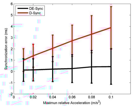 Figure 6 shows the mean and standard deviation of synchronization error for DE-Sync and D-Sync when the maximum relative acceleration of a node is varied between 0.01 m/s2 and 0.1 m/s2. Based on Equation (18), the accuracy of DE-Sync and D-Sync are affected by the maximum relative acceleration of nodes, in which the synchronization error increases with the increase of the maximum relative acceleration. Due to the fact that the maximum relative speed increases with the increase of maximum relative acceleration, considering Equation (19), we know that the increase of maximum relative speed leads to a greater synchronization error in D-Sync than DE-Sync. From Figure 6, simulation results are consistent with expectations that DE-Sync outperforms D-Sync.