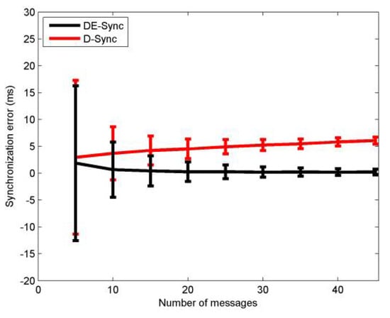 Figure 8 shows the mean and standard deviation of synchronization error for DE-Sync and D-Sync when the number of messages of a node is varied between 5 and 45. The standard deviation of synchronization error of DE-Sync and D-Sync decreases with the increase of the number of messages. Meanwhile, we set the acceleration of the node to be non-zero, and with the increase of the number of request messages, the moving speed among nodes also increases. According to the Equation (19), the increase of moving speed leads to the increase of the estimation error of relative speed among nodes in D-sync, so the mean of synchronization error increases with the increase of the number of request messages in D-sync. DE-Sync has a lower mean of synchronization error than D-Sync does. From Figure 8, simulation results are consistent with the expectation that DE-Sync outperforms D-Sync.