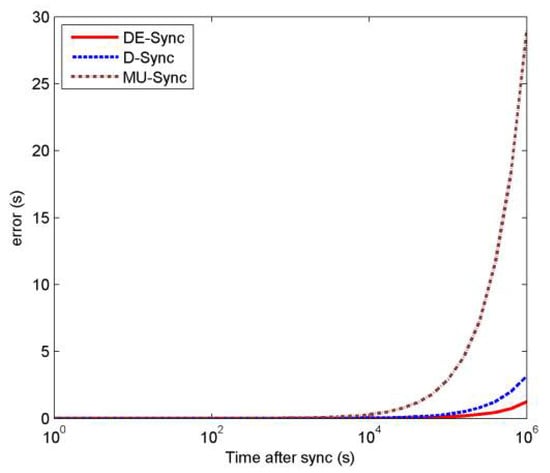 Figure 9 illustrates how errors grow after time synchronization completes with the three different schemes, namely, MU-Sync, D-Sync and DE-Sync. From this figure, we can see that DE-Sync works much better than MU-Sync and D-Sync, which achieves a more accurate skew, which affects the degree of synchronization error. MU-Sync assumes that the propagation delay of each round of message exchanges is constant, which causes larger errors. D-Sync ignores the effect of the clock skew when estimating the Doppler scale factor. In other words, when the clock skew is larger, the number of synchronization errors rises notably. As described before, DE-Sync corrects the shortcomings of the other schemes, which is the best among all schemes.