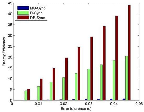 Note that, through observing Equation (21), we can know that the estimation accuracy of the skew determines the frequency of re-synchronization, which affects the energy efficiency. In other words, the scheme that has higher accuracy time synchronization will have higher energy efficiency. From this figure, with respect to D-Sync and MU-Sync, DE-Sync has higher energy efficiency, which saves power.
