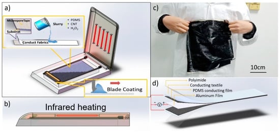 We first affixed the textile electrode on the template with 3M micropore tape, and then coated it with a 750-μm layer of premixed slurry on the electrode fabrics with a blade as shown in Figure 1a. The slurry was dried with infrared heating at 120 °C for 30 min as shown in Figure 1b. A foaming process occurred during the heating process; the self-decomposition of H2O2 was accelerated at an elevated temperature to create the porous structure. We finally peeled the film from the template and a 300 mm × 300 mm porous PDMS film with a textile electrode was fabricated successfully, as shown in Figure 1c.