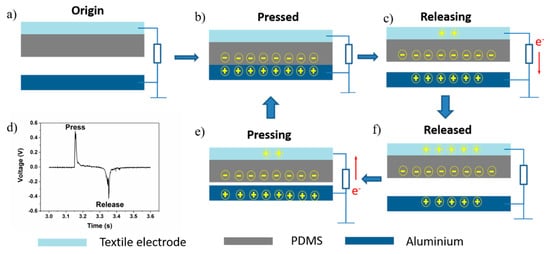 The working principle of the TENG is evident in the coupling of contact charging and electrostatic induction []. Figure 2 shows a schematic diagram of the TENG. In its original state, the TENG system is balanced—there are no charge movements and no potential difference between two electrodes, as shown in Figure 1a. As shown in Figure 2b, when the PDMS and aluminum contact each other, charges transfer between their surfaces due to their different abilities to gain or lose charge. The PDMS carries negative charge while the aluminum carries the same amount of positive charge which keeps the TENG in the balanced state. When TENG starts to separate, the balance is broken due to the electrical potential difference. The PDMS can retain charges on its surface which remains unchanged, so a balanced state is rebuilt. The charges on the electrode surface transfer from the PDMS electrode to the aluminum as shown in Figure 2c,f. When the two surfaces are brought together again (Figure 2e), the electrical balance is broken and rebuilt again; charges transfer from the aluminum back to the PMDS electrode until balance is reached (Figure 2b).