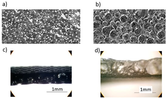 (a) Top surface of a carbon nanotube (CNT)-doped porous PDMS sample; (b) top surface of undoped porous PDMS sample; (c) cross sections of CNT-doped porous PDMS sample; (d) cross sections of undoped porous PDMS sample.