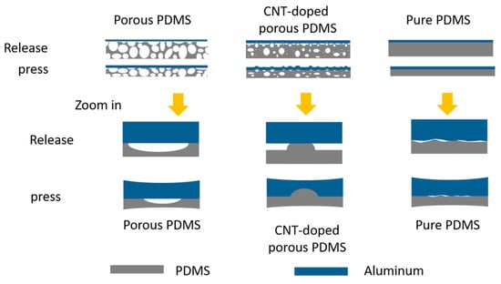 The porous PDMS is mainly composed of open cells with concave surfaces. The pore radius of curvature will be changed under pressure and lead to contact of the functional layer. CNT-doped porous PDMS mainly consists of closed cell structures with raised surfaces, and there are many irregular gaps are formed between the functional layers. In addition, microscopic contact defects exist between the dielectric and the electrode for pure PDMS without a porous structure, which is attributed to surface roughness, wrinkles and other factors.