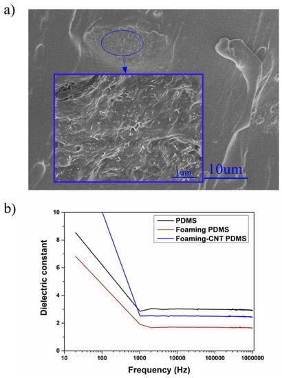 The influence of CNTs on the foaming structure can be ascribed to the curing process. We found that the foaming process was closely related to the gas production rate, PDMS curing time, and other mechanical properties in our sample (e.g., Young’s modulus). Polymer mechanical properties are often enhanced by the addition of nanoparticles. CNT material is commonly used to fabricate functional composites due to its unique characteristics including its large length radius ratio and excellent mechanical, electrical, and thermal properties [,,,]. The agglomeration of CNT in our PDMS sample exhibited random distribution on the macroscale, as shown in Figure 5a. The agglomeration of CNT created an “island-like” structure which had similar reinforcing behavior to the carbon black particle mechanism at the mesoscale [,]. At the micro-nano scale, the strengthening mechanism of CNT dominated the local reinforcement of the material. An isolated “island” does not create a conductive network, so the mechanical modification of PDMS did not affect its electrical properties and had negligible effect on the dielectric constant (Figure 5b). Sternstein’s group proposed that temporary (labile) bonding of chains to the nanofiller surface results in trapped entanglements, that have both near- and far-field effects on matrix chain motions. These trapped entanglements cause greatly enhanced non-Gaussian (Langevin) chain behavior that affects storage and loss moduli differently, resulting in very high reinforcement by nanofillers []. Huang’s group developed a Cohesion model based on van der Waals force interaction effect []. Follow-up works described the relationship between CNT and polymer matrix, and the relationship between interface stress and interface displacement from a physical point of view, they also developed a quantized method for measuring CNT reinforcement [].