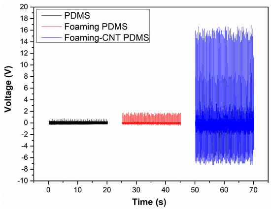 All samples were tested with the same vibrator at the same speed and force. The voltage patterns were measured for 20 s as shown in Figure 6. The TENG with CNT-doped porous PDMS showed a much higher voltage output (16 V) while the TENG with pure PDMS and the TENG with undoped PDMS with a foaming structure had voltage outputs of 0.7 V and 2.2 V, respectively. The elevated voltage output is mainly attributable to the foaming structure and doping of CNT; the foaming structure allowed for faster contact speed and increased the contact area, and the addition of CNT reinforced the foaming structure to further enhance these qualities. According to Equation (1), fast contact speed and a large contact area result in a larger voltage output. The positive part was larger than the negative part due to the contact and separation speed as well—the contact speed was faster than the separation speed due to the foaming structure.