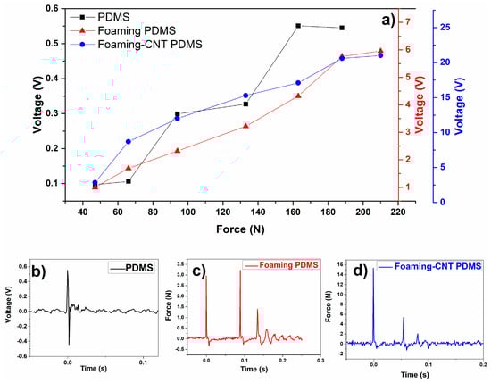 (a) Voltage outputs as a function of applied force; (b) voltage output pattern for TENG with pure PDMS; (c) voltage output pattern for TENG with undoped porous PDMS; (d) voltage output pattern for TENG with CNT-doped porous PDMS.