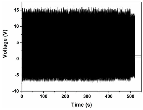 We also investigated the stability of the CNT-doped porous TENG sample with a mechanical shaker. A pressure of 2.5 kPa and frequency of 5 Hz was applied for 5 h. Figure 8 shows the last 500 s of recorded voltage output, which exhibits negligible changes after 90,000 cycles of fatigue testing. The CNT-doped porous TENG appears to have very high stability and durability.