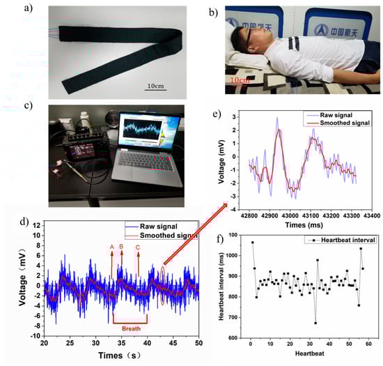(a) Sleep monitoring belt; (b) user sleeping with monitoring belt; (c) measurement system setup; (d) real-time voltage output of breath and heartbeat; (e) enlarged heartbeat signal; (f) heartbeat interval distribution.
