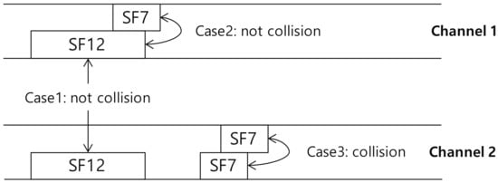 Figure 2 illustrates multiple access control in the LoRaWAN. For simplicity, we assume that the number of available s is two, and . In case 1, although two signals generated with arrive at the same time, they can be successfully decoded because of different channel usage. In case 2, owing to the orthogonality, the collision can be avoided, even though multiple devices use the same channel. However, the collision occurs in case 3 since the two signals generated with the same () arrive on the same channel. In conclusion, a collision occurs only when the multiple signals generated with the same overlap on the same channel.