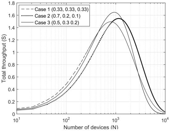 This section presents the numerical results of the proposed method. We calculated the total throughput with respect to the total number of devices ranging from 0 to 10,000. We assumed that the gateway knows the smallest available of each device by measuring the SNRs. Originally, ADR in the LoRaWAN was designed for static devices, so SNR variation is assumed to be small. Meanwhile, the number of devices using the large s should be relatively small in the total throughput optimization. Therefore, we supposed that just three kinds of s, i.e., , , and are used, for a clear explanation. It is reasonable because the devices far away from a gateway are likely to communicate with other nearby gateways. The channel occupation time per device is limited to the duty-cycle because LoRa works at the unlicensed band []. In EU863-870, the duty-cycle is 1%, accordingly we roughly decide the transmission probability of all the devices to be 0.01.