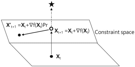This paper adopts the gradient projection method to solve the constrained optimization problem []. This algorithm is improved from the gradient descent method that finds the optimal value by iteratively updating the current solution in a small gradient direction. Both algorithms are based on the fact that the optimal is found at the point where the gradient of the objective function is zero. In particular, in gradient projection method, the next solution is always examined to determine if it violates the given constraints. If it is determined that the constraint will be violated, the next solution is projected into the constraint space. Figure 4 geometrically illustrates the process finding an optimal in the gradient projection method. The solution found at the tth time step has to be updated in the direction in which the optimal marked as star exists. However, is out of the constraint spaces, i.e., constraint violation occurs. To find the optimal on the feasible space, is projected into the constraint space by using the projection matrix . In conclusion, is updated to the next projected solution, .