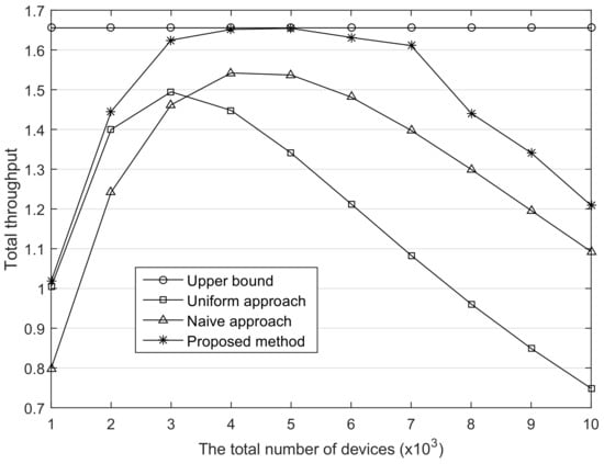 Figure 5 shows the total throughput according to the number of devices, assuming that the number of channels is 3. As shown in the figure, until the throughput reaches the peaks, they gradually increase. In addition, when the number of devices is small, the uniform approach is better than the naive approach owing to the less contention. However, as the number of devices increases, the naive approach is better than the uniform approach. This is because the smaller the used, the lower the rate of increase in the number of devices to the throughput reduction rate. Therefore, in the case that enormous devices are deployed at the network, it is recommended that a majority of devices uses as small of s as possible. Meanwhile, the proposed method provides higher performance than the others in all cases. Especially when the number of nodes is between 4000 and 6000, which leads to saturation throughput in the proposed method; the throughput is close to the theoretical upper bound. This result implies that the contention problem caused by the adjusted data rate must be appropriately handled. In addition, the ADR policy should be dynamically changed according to the network state.