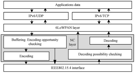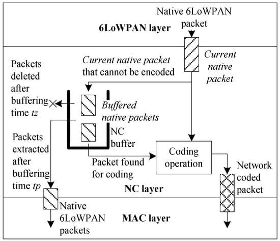 In order to increase the coding opportunity in softly loaded WSNs, the native packets have to be buffered and slightly delayed in some nodes. What is more, the NC6LoWPAN does not collect all of the overheard packets, because of the sensors’ memory limitations. Thus, the main function of the NC layer in the NC6LoWPAN is to buffer the native unicast packets belonging to different sessions, check the coding opportunity, prepare encoded broadcast packets using bitwise XOR operation (according to Equation (7)), and perform decoding. The location of the NC layer that is shown in Figure 2 provides implementation simplicity, which is required in resource-limited sensor nodes. Furthermore, the NC layer allows for coding and decoding of the 6LoWPAN datagrams rather than the IPv6 packets.