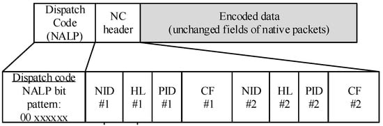 A network coding procedure in an intermediate node (CurrentNodeRole = RelayNode) starts in Step 33. Additionally, Figure 4 graphically illustrates coding scheme. The NC buffer is searched (Step 34) for buffered native packets that can be used for coding operation (Step 34). The buffered native packets meeting the coding rules are extracted from the NC buffer and are coded with the current native packet (Step 37). The coding rule requires that the buffered native packets, which are stored in the NC buffer, will be sent to their final destination over the node from which the current native packet was received. The encoded packet (Step 38) preceded by a Dispatch and NC layer headers (Figure 5) is sent to the MAC layer and broadcast. In order to simplify the decoding procedure, the identifiers of the recipients (hash of the recipients’ MAC addresses) are added to the NC header.