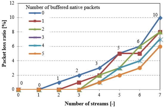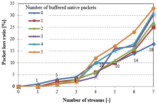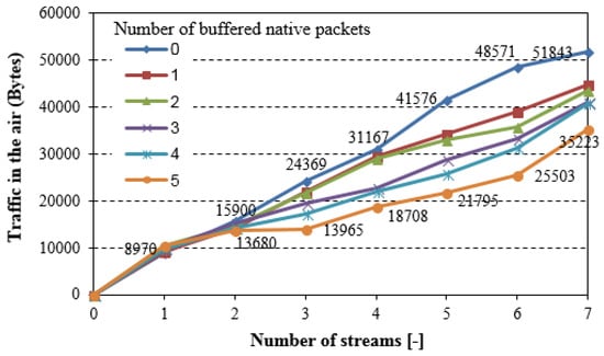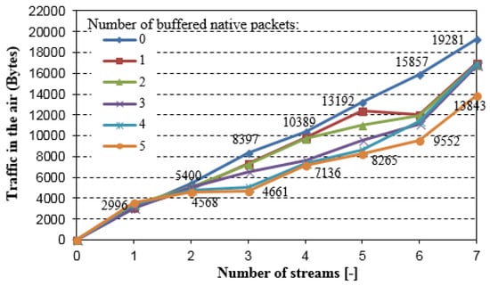 Figure 7 shows the overall traffic that is captured in the air as a function of the number of packet streams in one direction for different values of the NC buffer length (number of buffered native packets). If the NC buffer is full and a new native packet appears, the oldest packet stored in the NC buffer is immediately sent. The results confirm that the decrease in the overall network load directly depends on the traffic volume that is generated by the nodes, and on NC buffers capacity. It means that network coding in WSNs gives better results for higher traffic volume in the network. Unfortunately, the memory that is allocated for NC buffer is limited due to the sensor nodes resource limitations, which in consequence limits coding opportunity. Furthermore, the allocation of the memory for NC buffers in the nodes with significant memory limitation can increase the packets loss ratio because of the lack of free space for routed packets in the intermediate nodes.